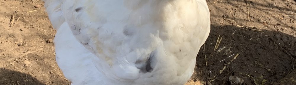 We worked as a team to catch the two roosters, which were both white with gray patches on their backs. They’d been hatched by my broody hen who preferred sitting on eggs to laying them. Two months after playing mom to these boys and their four broodmates, she was sitting on eggs again and already had two chicks.