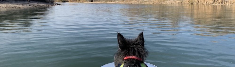 Penny came along, of course, I prepped the boat by securing her fleece blanket on the bow so she’d have some traction when she stood or sat there. I also put her life jacket on so I wouldn’t have to worry about her trying to swim if she fell in. Because the water had virtually no current, I didn’t bother tethering her to the boat. She’s only fallen in once and that was a long time ago in my old kayak. I didn’t expect her to fall in today, but if she did, I knew she wouldn’t get swept away.