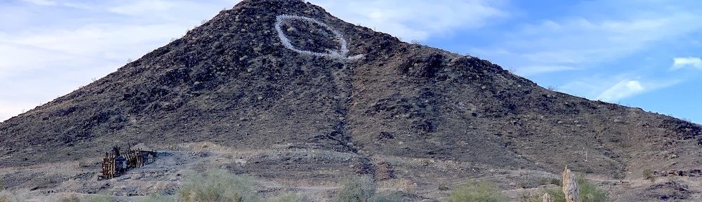 Janet and I did 2-1/2+ mile hikes almost every morning we were in Quartzsite. Our route took us past the foot of Q Mountain, a hill/butte in the southwest corner of town that was the highest point in the area. It looked pretty steep from the ground, but when the two of us finally got around to climbing it, we discovered that it really wasn’t so bad. Here are some of the views.