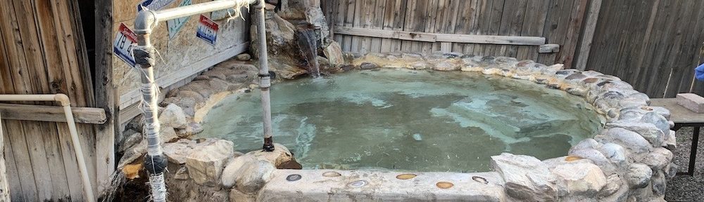 I’ll start by saying this: it’s a weird place. Located just south of I-10, it has several electric and water hookup sites, as well as some overflow sites, which is where we ended up. The place has peacocks and a very large pig roaming around. There are two kinds of tubs: the big public tub, which you can use as much as you like when you pay for a campsite, or a private tub, which you must reserve and can only use for an hour. The catch: clothing is not allowed in the public tub.