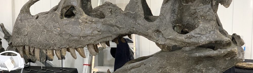 I was in Tucson at the beginning of February, mostly to take five jewelry-making classes, but also to hit a few of the gem and mineral shows. I had a whole afternoon to goof off and hit the 24th Street Show, which I’d missed the previous year. There were lots of fossils there, including a few full skeletons of dinosaurs, like this one.