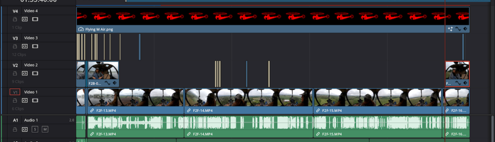 Now because my videos are so long, they normally have multiple video files from each camera. That’s easy enough to deal with: when one clip ends, I just insert the next one, being sure to butt it up against the previous one. I do this for both views, even if I don’t plan on showing the back-facing view. After all, I still need the corresponding helicopter engine audio, don’t I? I just separate the video from the audio on that back-facing video and put the video portion on a hidden track so it doesn’t appear. Later, when I know I don’t need that portion of video track, I just delete it from the timeline.