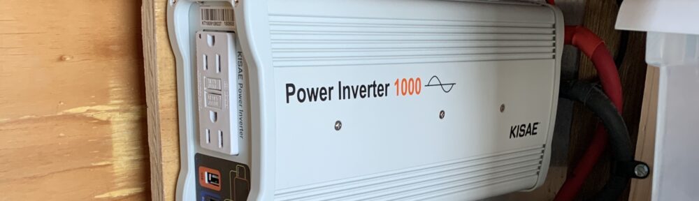 Here’s the inverter, mounted in the front corner of my trailer just under one of the shelves. I’ll likely use the area around it as a charging station for various batteries in the future.