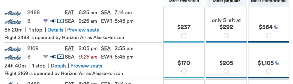 But what I discovered is that if I buy my ticket far enough in advance and I’m flexible about travel dates and times, I can often buy a first class ticket for just $100 to $300 more than coach. Here’s a random example for Alaska Air; in this case, if I were going to visit my brother in New Jersey, I’d be buying that First Class ticket leaving Wenatchee at 6:25 AM (keeping in mind that I’m a very early riser):
