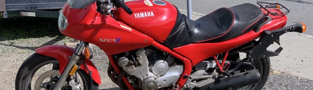 It’s a 1993 Yamaha Seca II that I bought brand new in 1992. I vividly recall the day I bought it in Paramus, NJ. I was still riding my first bike, a 1981 (I think) Honda CB 400 Hawk. I’d gone to Americade in Lake George, NY, with my future wasband and the sport touring motorcycle club we rode with and had test ridden the Seca II. It had more power and was sportier than the Hawk. I decided to upgrade and went to the Yamaha dealer in Paramus. I did the paperwork for the bike and then went next door to the BMW car dealer with my future wasband, who was a big BMW fan. They had a new 1991 (I think) K65 (I think) parked in the lobby area. He bought it. We showed up a week or two later at a club event, each riding brand new bikes.