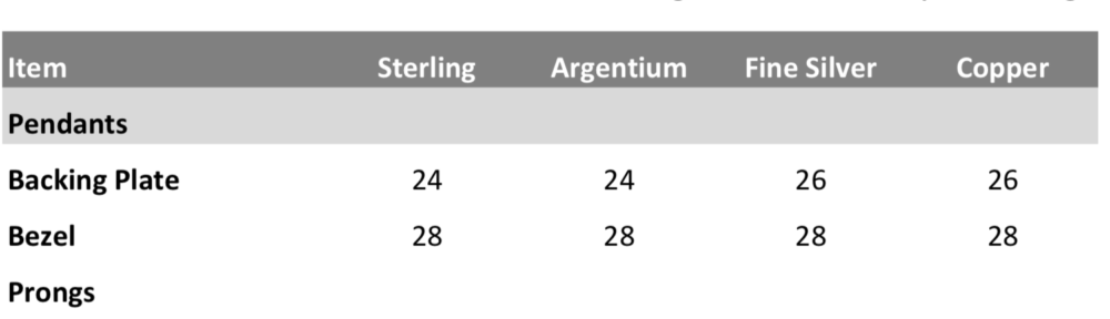 I stumbled upon one on the Rio Grande website recently. It was almost what I needed. I modified it to add information I needed and remove metals I don’t work with. (I only work with sterling, Argentium, and Fine silver and copper.) Here’s the result: