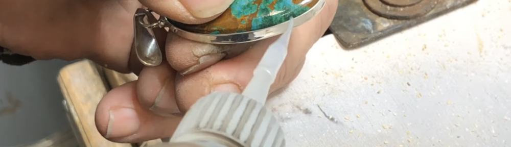 Of course, he kept gluing. I turned it off. I couldn’t bear to watch him permanently affix, with “superglue,” a beautiful cabochon to a very nice sterling silver setting and the sawdust beneath it with glue.