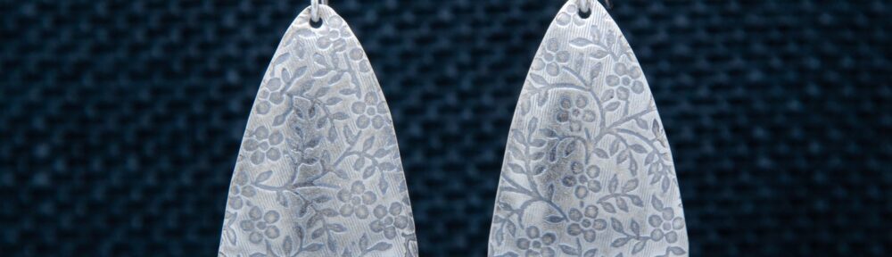 I tweeted my progress while creating these earrings, using a Twitter thread with photos. I skipped tweeting the first step, which was getting the pattern onto the silver — I don’t buy sheet silver with a pattern already on it (although I do sell it that way) — but got most of the other steps. They make up good documentation for this blog post’s purpose, which is to talk about what actually goes into making something from scratch: materials, tools, skills, and time.