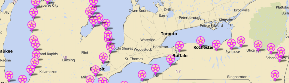 Once I zoomed out, the route became clear. While it looks like we’re boating across dry land as we cross New York, it also clearly shows which side of each of the Great Lakes we’ll be cruising along and the fact that points seem closer together on the Lakes than in the Canal.