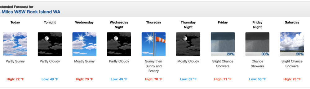 - National Weather Service Forecast. I don’t care what anyone says about their favorite source of weather information. In the U.S., all weather data comes from NOAA and is made available on the NWS website. That’s Weather.GOV, not Weather.COM. I have point forecasts set up for the three areas that interest me most: Malaga, Quincy, and Mattawa. I have bookmarks set up for all three on my laptop computer, desktop computer, iPhone, and iPad. Throughout the day, I consult them numerous times. When there’s rain forecasted for the near future, I also look at the hourly forecast to see what time of day the rain might come.