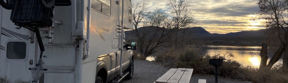 Here’s my camper, parked at a free campground in Nevada that offers picnic tables, grills, fire pits, and access to a lake filled with migratory birds — and not much else.