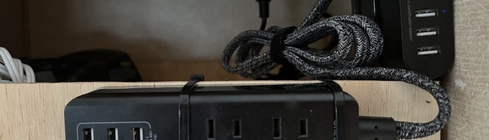 Here’s a closeup look at the two power ports I affixed with zip ties. The vertical one is all USB ports and is DC powered. It’ll work any time. The horizontal one is two standard outlets and three USB ports and is AC powered. It’ll work any time my camper is plugged in to an AC power source, including my generator.