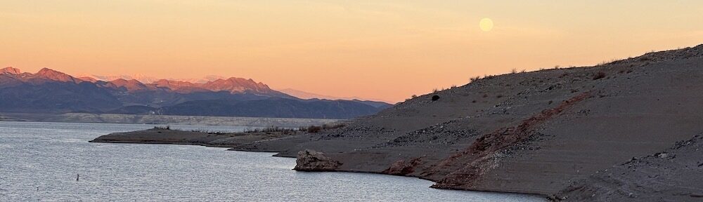 We went on a few walks along the water’s edge on Saturday and Sunday, midday and in the evening. Although there were rocky slopes on both sides of the cove, the burros and the action of the water as it receded over the years had formed flat trails at various levels. They were easy to walk on and gave me various views of the area and beyond. On these walks I let my pups loose so they could run a bit; the coyote stayed out of sight. Beyond that, there wasn’t much hiking available from my camper.