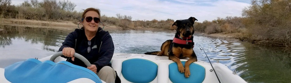 Although I didn’t use the boat as much as I liked when I took it back to Arizona, it was good for a few outings on the Colorado River, Lake Pleasant, and Lake Havasu. Here’s my old dog Penny with Janet’s dog Dually on the bow when we headed out to the Colorado River late one afternoon.