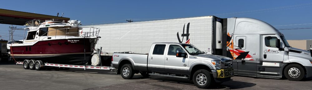 The boat trailer is about 36 feet long. It’s a bumper pull so wide turns are required. I fueled up with the big rig truckers at truck stops.