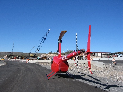 How often do you get to land a helicopter right next to a major roadway? I did it at the beginning of the month for Don Green, who was photographing a bridge under contruction further up the road. He was kind enough to take a photo of me with Zero-Mike-Lima and e-mail it to me today. Is that helicopter RED or what?